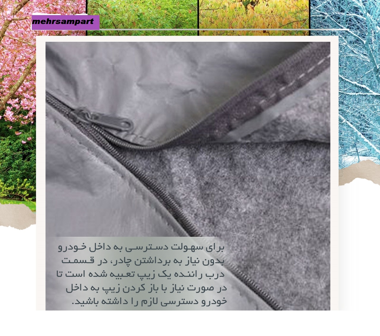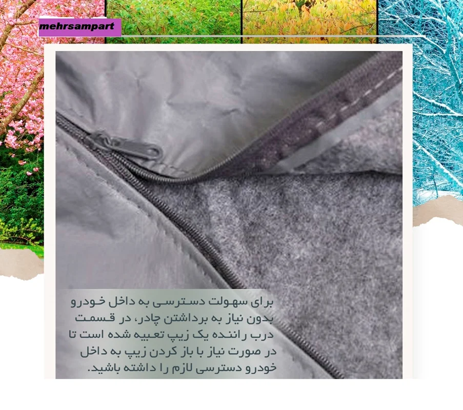 عدم نفوذ آب به علت وجود لایه (pvc) - عدم ایجاد خط و خش - دارای لایه داخلی کرکی - دارای زیپ درب راننده - دارای کش در دو سر سپر - دارای جای آینه - دارای ساک مخصوص برند خودرو شما برای حمل آسان - مناسب برای همه فصول سال